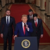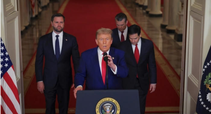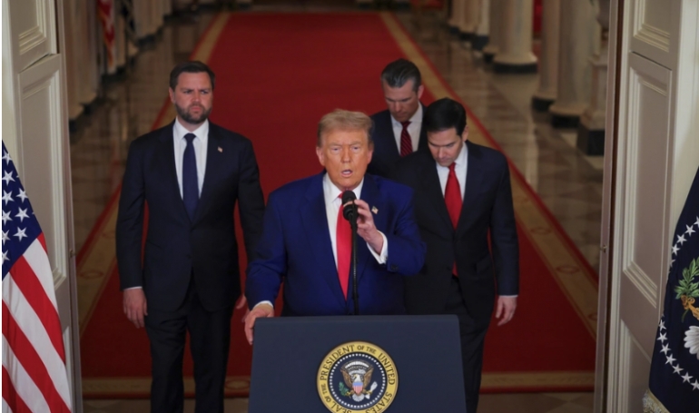 President Donald Trump speaks from the East Room of the White House in Washington on June 21, 2025, after the U.S. military struck three Iranian nuclear and military sites, as Vice President JD Vance, Secretary of State Marco Rubio and Defense Secretary Pete Hegseth listen. | Pool photo by Carlos Barria